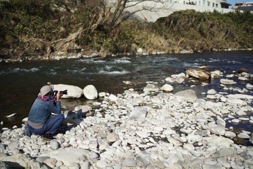 1時間程の座学終了後、撮影スタート地点の霊屋橋下流の河川敷へ徒歩で向かいました。